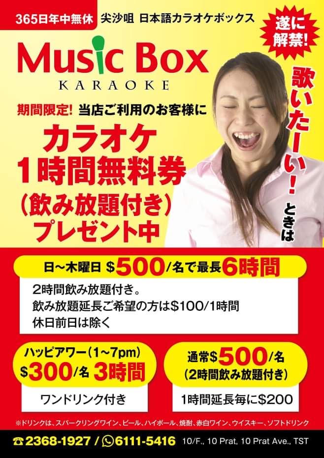 Music Box カラオケボックス10F 10 Prat10 Prat AvenueTST, Kowloonph: 852-2368-1927shinjiichinose@hotmail.com